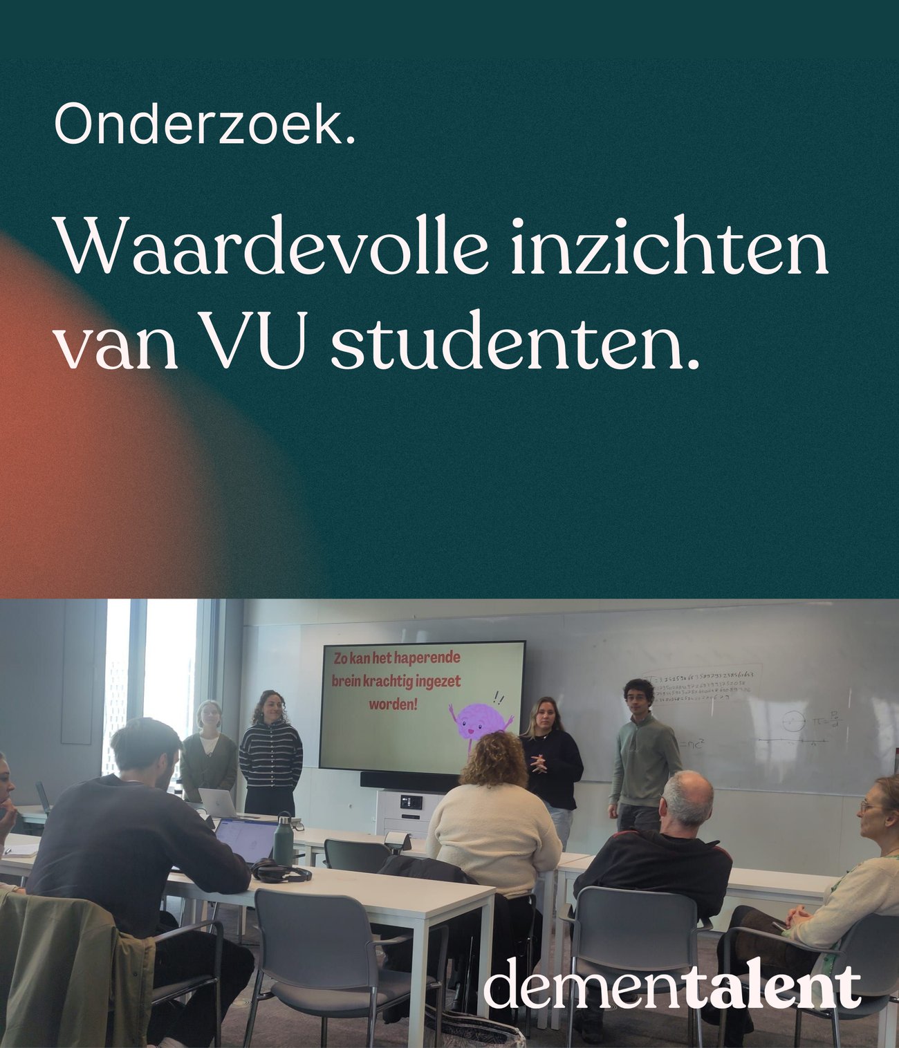 Het resultaat is een aantal waardevolle inzichten en concrete acties! Zo gaan we onder andere brochures met QR-codes verspreiden onder zorgprofessionals en DemenTalent beter zichtbaar maken op websites van samenwerkingspartners. Ook maakten de studenten een toffe video voor zorgprofessionals waarin de meerwaarde van DemenTalent op een creatieve manier wordt uitgelegd. |
